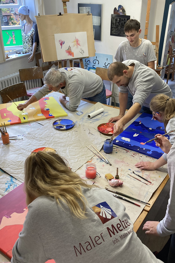 Wir bereiten den Tisch vor, auf dem alle Farben und gewünschten Materialien auf ihren Einsatz warten. Die Teilnehmenden arbeiten an einem Gemeinschaftswerk, mehreren Teilen eines großen Ganzen oder unterstützen sich bei ihren individuellen Ausarbeitungen. Es können Kunstwerke auf Leinwand, Papier, aus Holz, Speckstein oder Modelliermasse entstehen.
