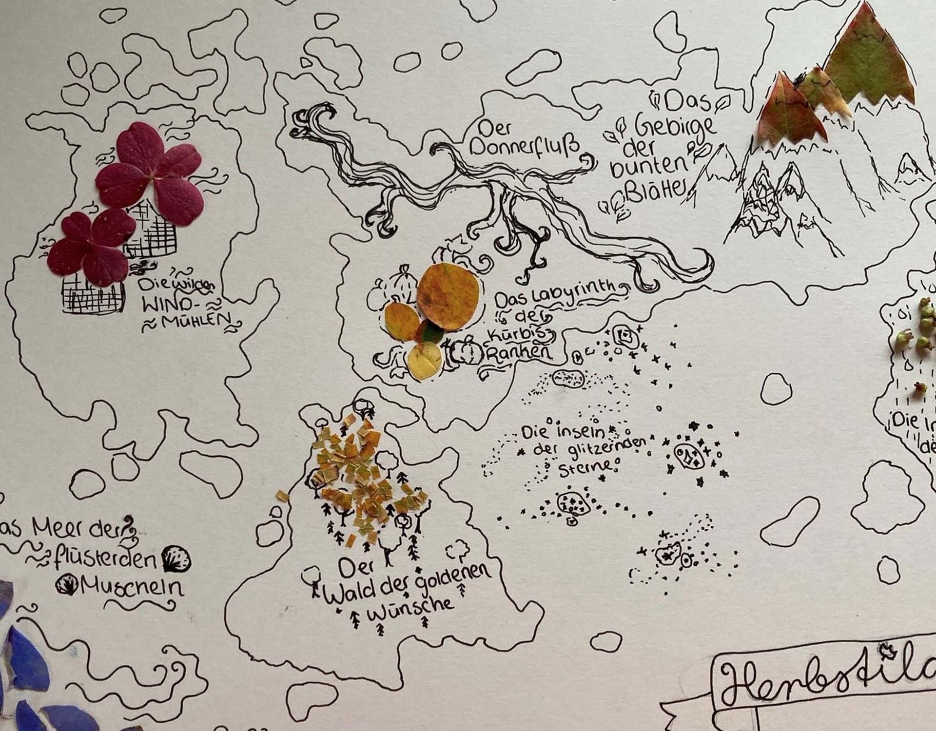 Mit Naturmaterialien wie Moos, Blätter und Blüten basteln wir eine Karte mit zauberhaften Kürbiswäldern, Blättergebirgen, zeichnen das Meer der flüsternden Muscheln, die Insel der glitzernden Sterne, den Donnerfluss,… und noch viel mehr.