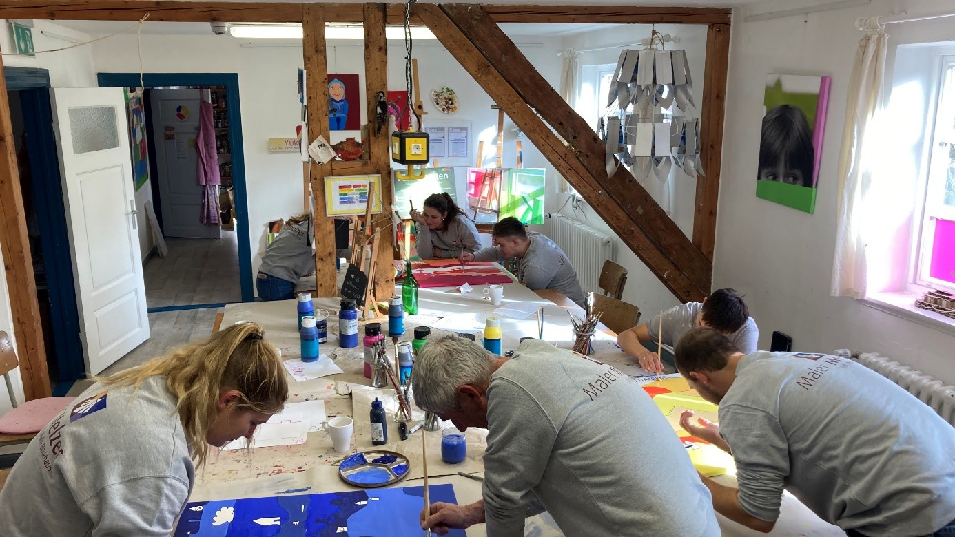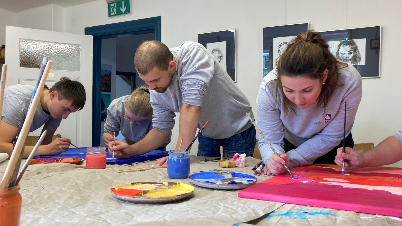 Wir bereiten den Tisch vor, auf dem alle Farben und gewünschten Materialien auf ihren Einsatz warten. Die Teilnehmenden arbeiten an einem Gemeinschaftswerk, mehreren Teilen eines großen Ganzen oder unterstützen sich bei ihren individuellen Ausarbeitungen. Es können Kunstwerke auf Leinwand, Papier, aus Holz, Speckstein oder Modelliermasse entstehen.